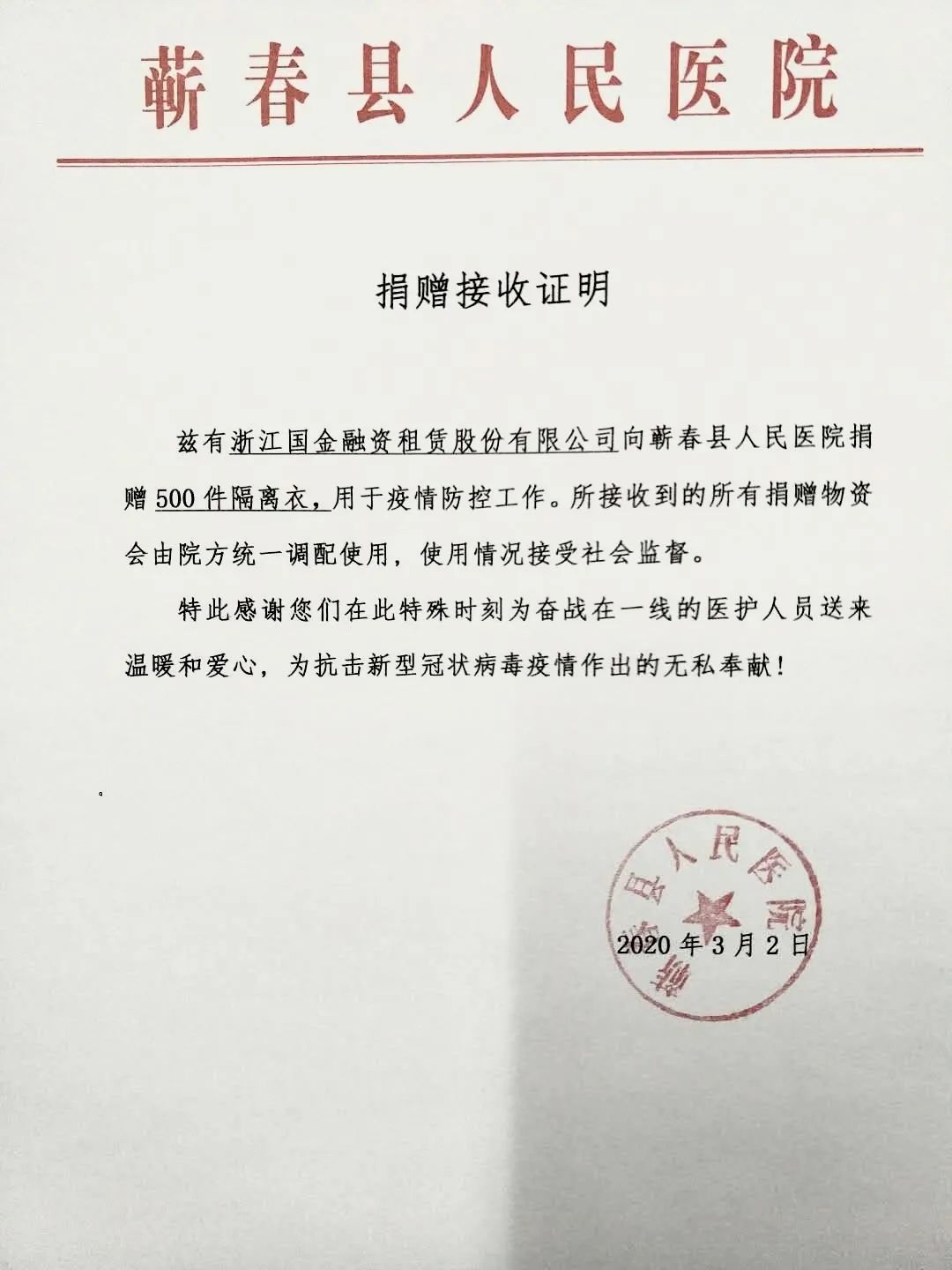 春节期间,公司领导高度重视,要求综合管理部详细部署安排复工方案,实时跟踪统计返岗复工人员信息,为安全有序复工做好充分准备。延期复工期间,各业务部门通过电话、网络等多种方式与客户一一保持联系,及时掌握疫情对承租人的影响和急需解决的困难;深入挖掘客户的潜在需求,构建“共克时艰合作客户需求统计表”。复工当天,公司领导第一时间召集各业务部门负责人进行一对一约谈,问经营、查防控,深入了解疫情对业务开展的影响以及所合作客户的实际困难,鼓励国金租赁全体员工以高度的责任感,在严格落实各项防控措施的前提下,克服短期困难,分阶段分步骤扎实推进复工复产各项工作。 新冠疫情给国金租赁的部分承租户经营造成了一定冲击。一直以来,公司坚持以服务客户为出发点,提供专业化金融服务。在新冠疫情期间,根据《银保监会办公厅关于进一步做好疫情防控金融服务的通知》要求,通过摸底排查,公司了解到承租人蕲春县人民医院隶属于湖北省黄冈市,是此次疫情的重灾区,所在区域防疫抗疫任务非常艰巨。因消耗巨大,各种医疗防护物资奇缺,医院发布了接受社会各界爱心捐赠的紧急公告。为解承租人燃眉之急,国金租赁一方面考虑同意暂缓其偿还到期租金五百多万元,以助其全力以赴对抗疫情;另一方面利用自身与医疗机构合作较多的人脉优势,主动联系相关医疗用品供应商,反复查询核实供应商和产品的资质,寻找符合承租人要求的紧缺物资。公司全体员工在经营班子带领下踊跃捐款,共筹集近十万元采购符合标准的医用隔离衣500件驰援医院,以实际行动向奋战在防控一线的医护人员致敬,助力打好打赢疫情防控阻击战。