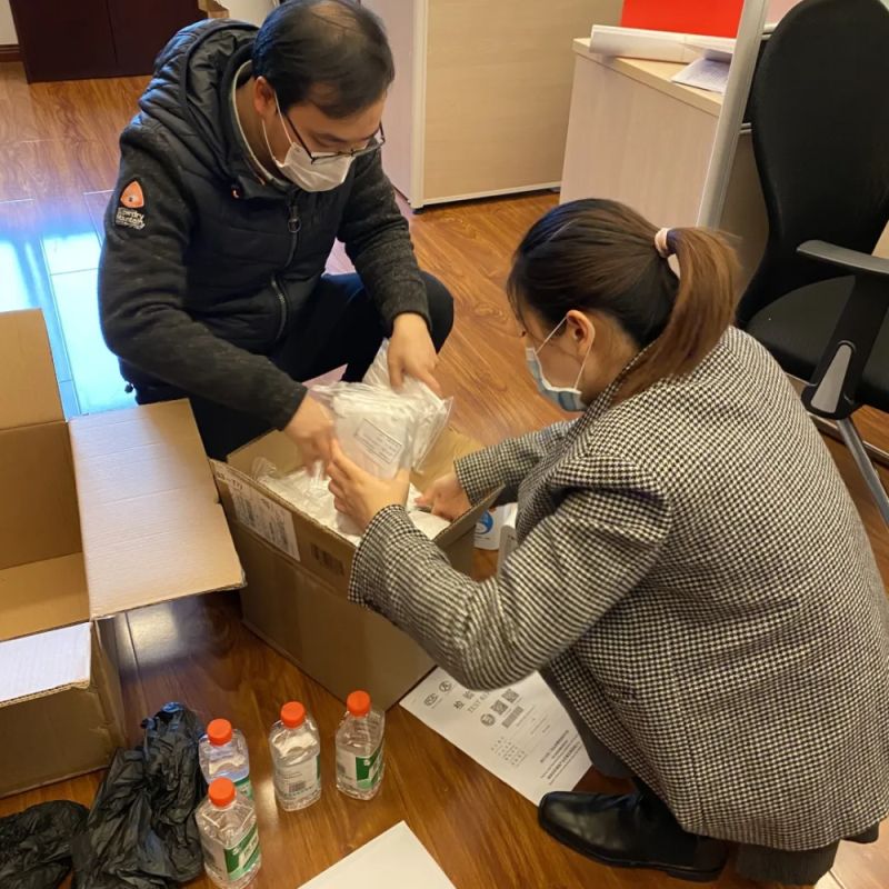 同事们精心打包准备捐赠给学校的防疫物资。 2020.03.02 寄送捐赠物资 ![]() 将捐赠物资托付快递小哥送出。