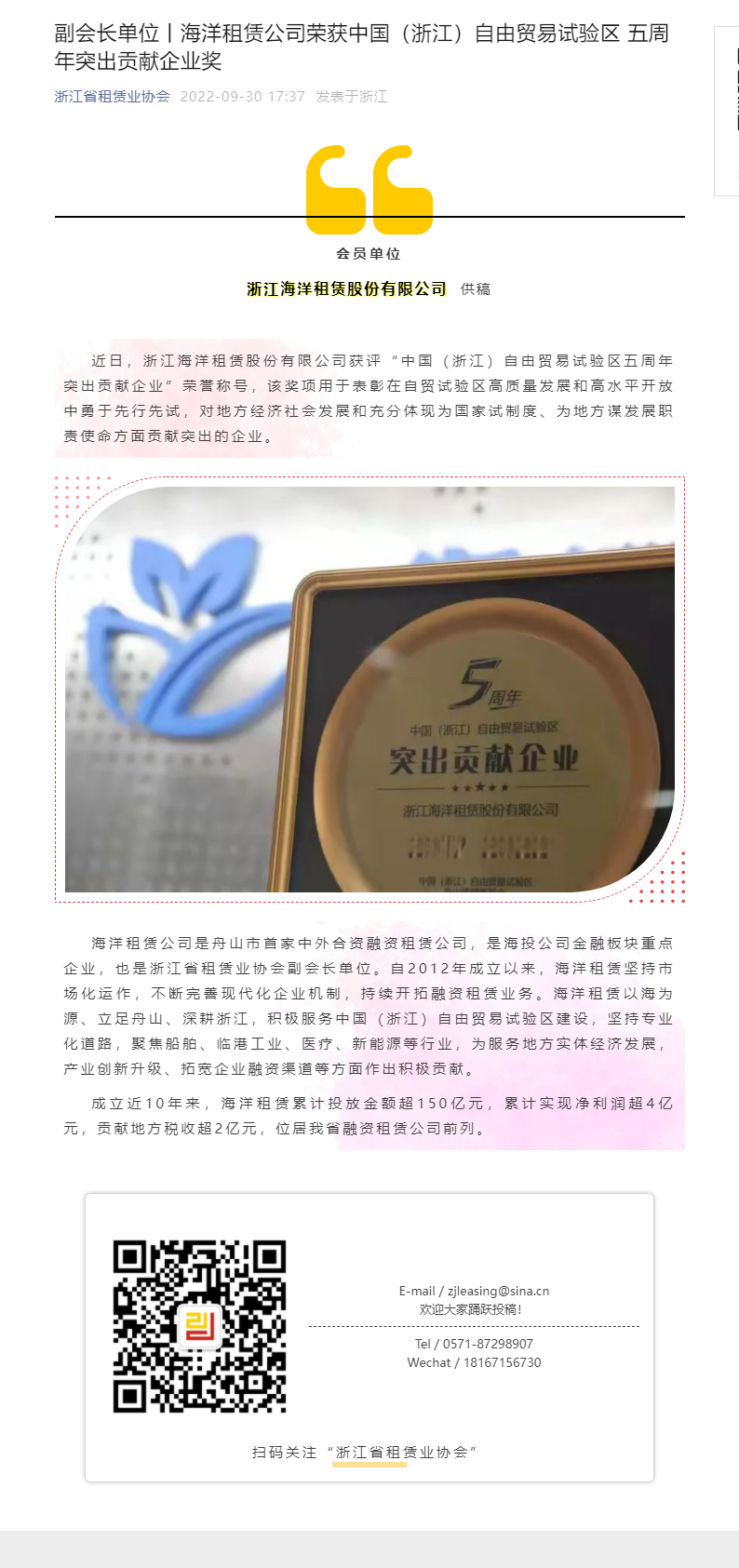 副会长单位丨海洋租赁公司荣获中国(浙江)自由贸易试验区 五周年突出贡献企业奖