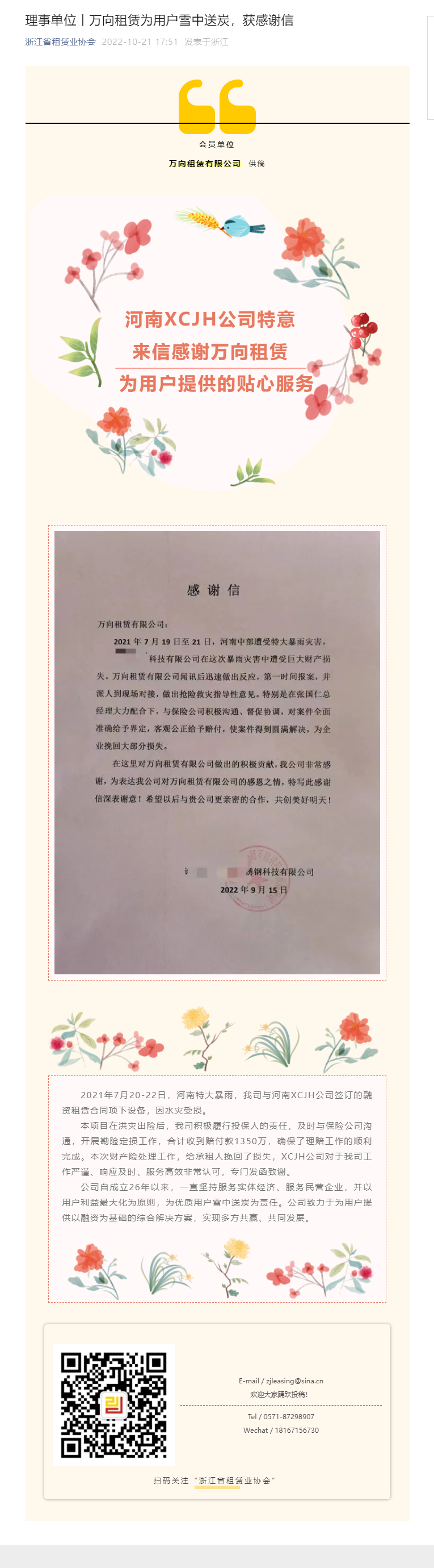 理事单位丨万向租赁为用户雪中送炭,获感谢信
