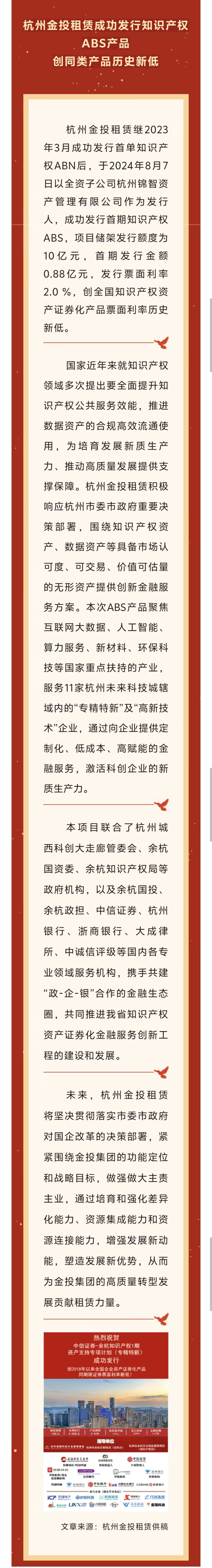杭州金投租赁成功发行知识产权ABS产品创同类产品历史新低