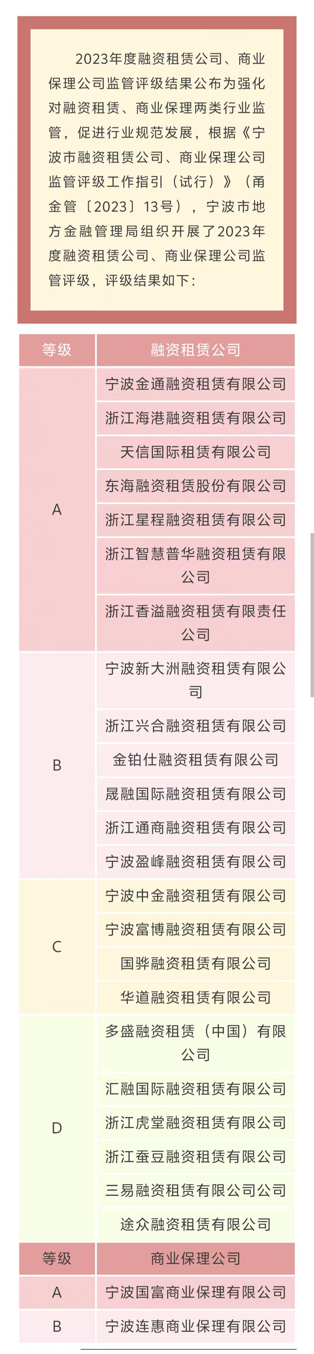宁波公布2023年度融资租赁公司监管评级结果