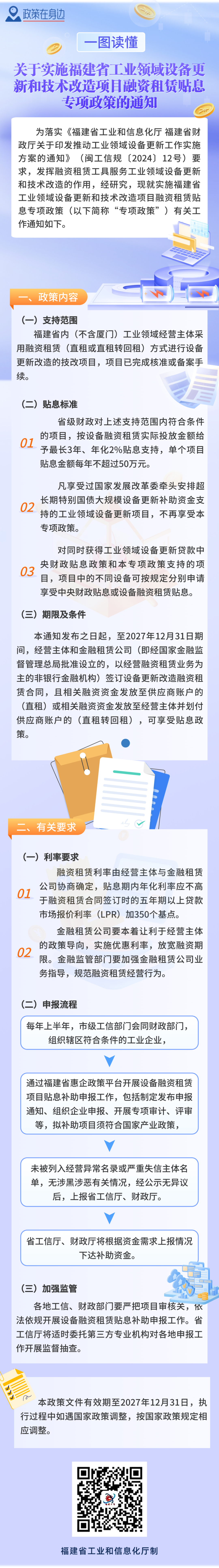 福建省:出台工业领域设备更新和技术改造项目融资租赁贴息专项政策