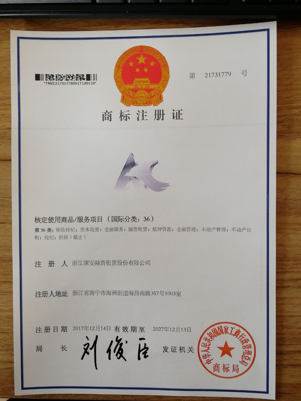 浙江康安融资租赁有限公司logo注册申请成功 |