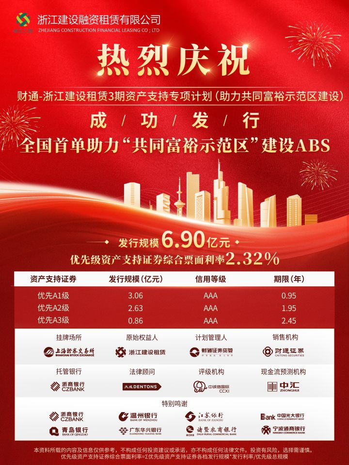11月4日,浙江建设融资租赁有限公司(以下简称建设租赁)于上海证券交易所成功发行“财通-浙江建设租赁3期资产支持专项计划(助力共同富裕示范区建设)”债券,发行总规模6.9亿元。