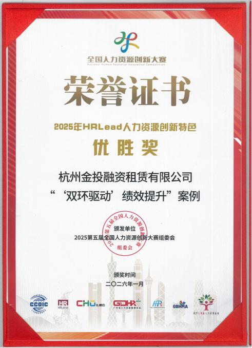 由杭州金投融资租赁有限公司申报的《“双环驱动”绩效提升人力资源改革创新》案例从全国500余份参赛案例中脱颖而出,荣获第五届全国人力资源创新大赛特色案例奖项。