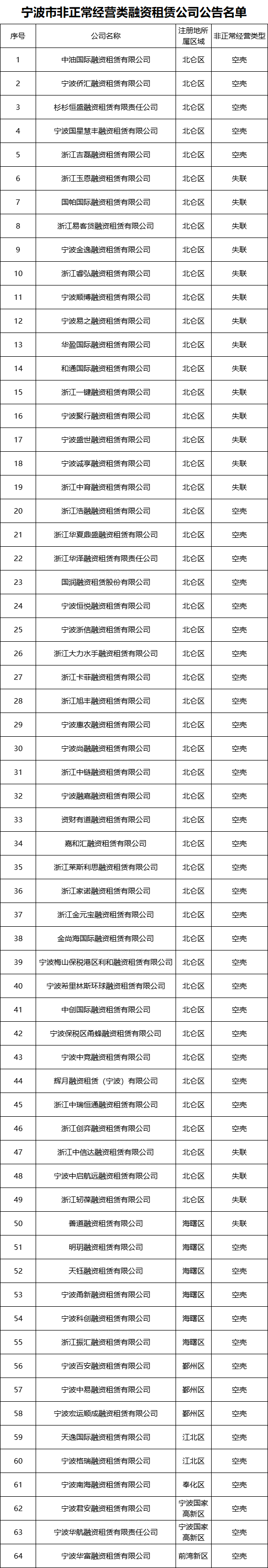 宁波:公布2022年度非正常经营融资租赁公司名单 |