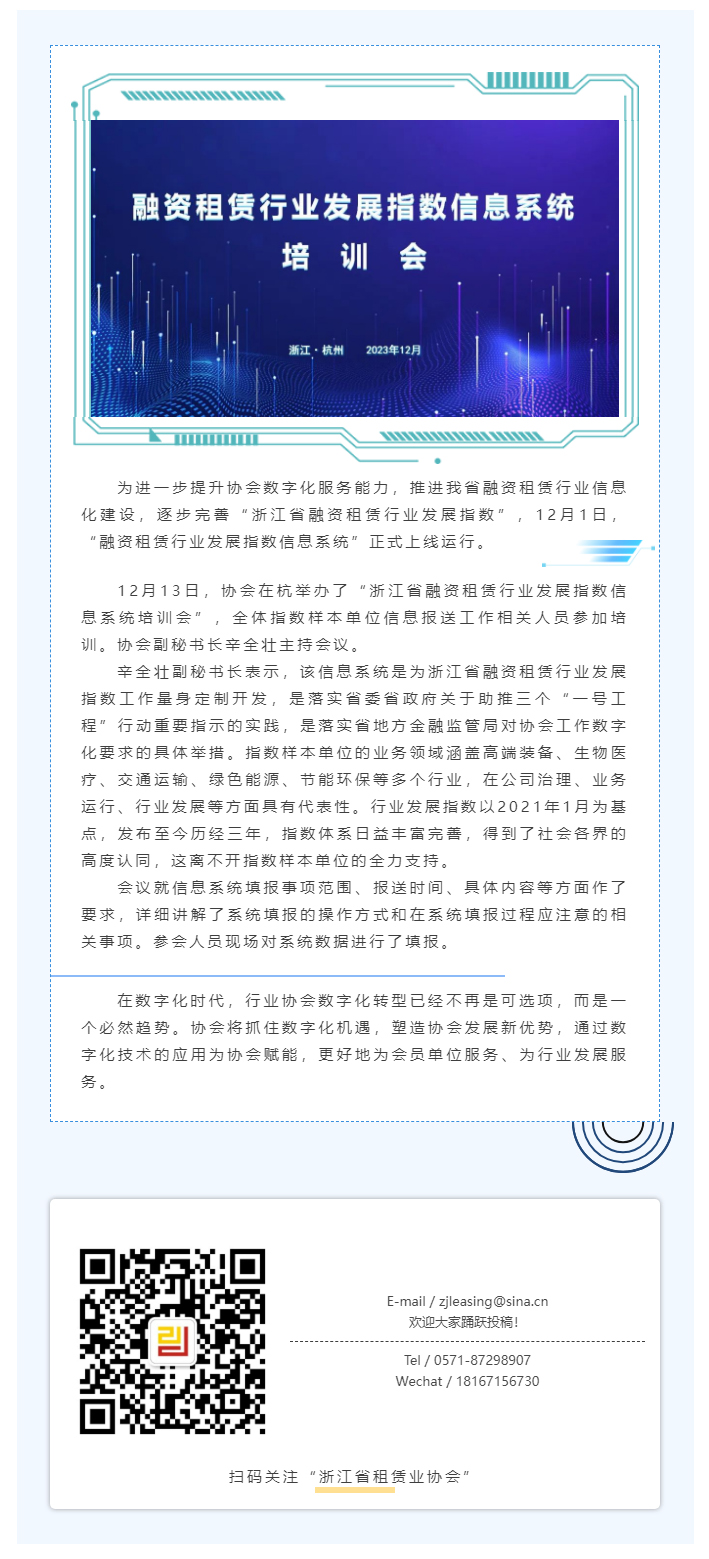 “融资租赁行业发展指数信息系统”正式上线——暨“浙江省融资租赁行业发展指数信息系统培训会”在杭召开