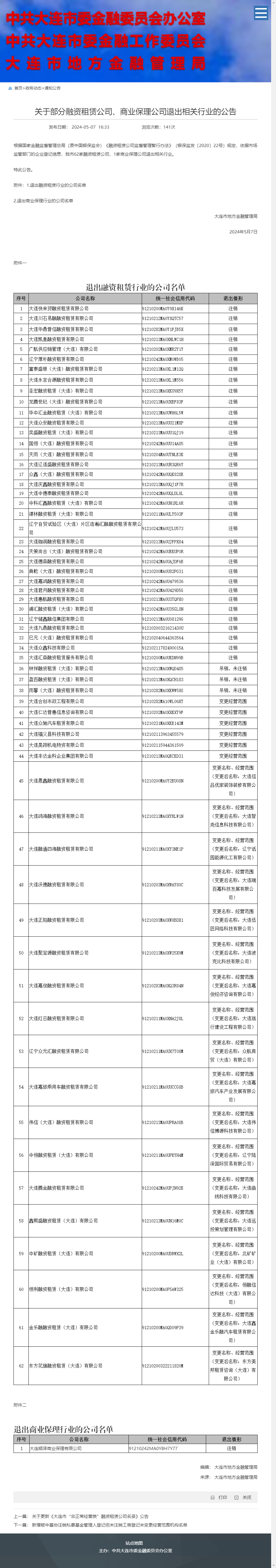 大连:62家融资租赁企业退出行业,484家融资租赁企业被列入“非正常经营类”名录 |