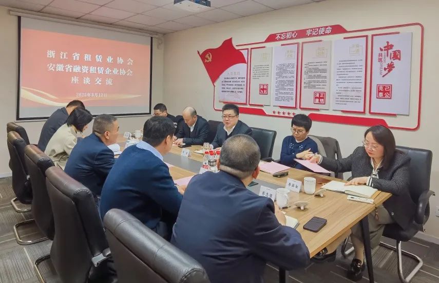 3月12日,浙江省租赁业协会与安徽省融资租赁企业协会“两新”工作座谈会在浙江举行,交流互鉴运用融资租赁工具支持大规模设备更新及服务实体经济方面的经验和做法。安徽协会会长张宝彪、合肥市财政局金融处处长夏亮、合肥市地方金融管理局金融监管处处长汪松、浙江省地方金融管理局金融监管处四级调研员陈智静等相关领导及两省企业代表参加座谈。此次会议由协会会长何凌主持。