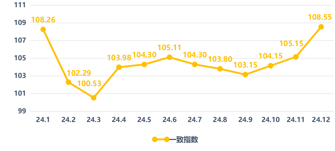 2024年一致指数呈“先降后升”状态,一季度受多重因素影响,一致指数发展势头减弱;二季度指数快速回升,随后平稳发展;三季度略有回落,整体发展态势较为平稳;四季度加速攀升至全年最高点,保持了持续发展势头。