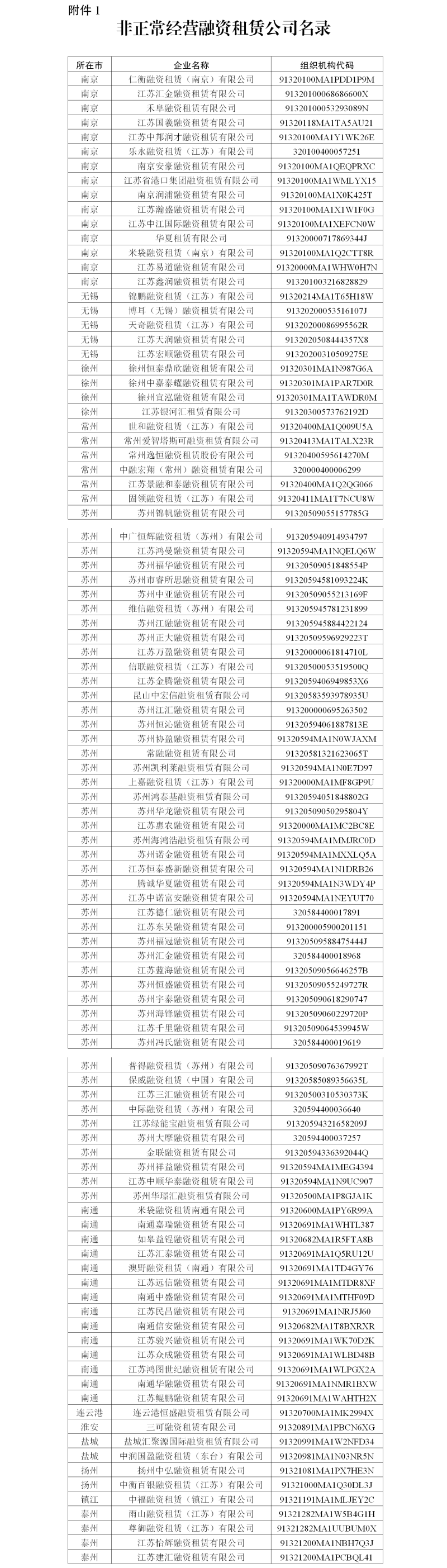 江苏省地方金融管理局发布关于部分非正常经营融资租赁公司的通报 |