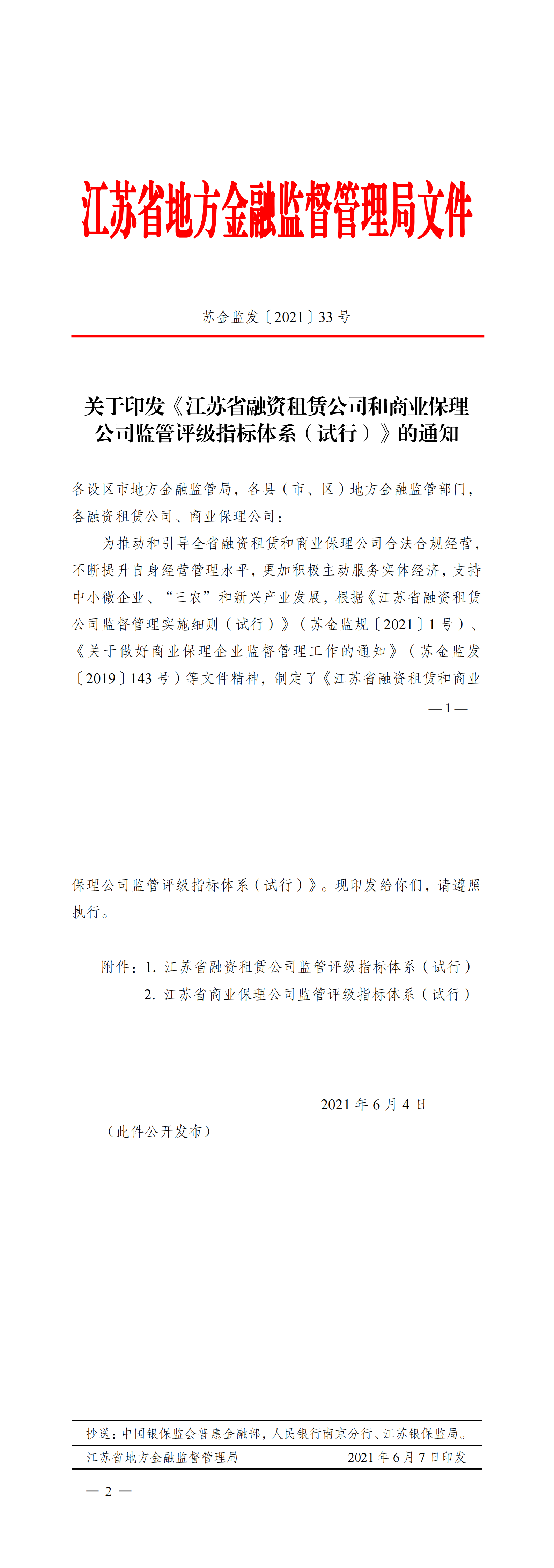 关于印发《江苏省融资租赁公司、商业保理公司监管评级指标体系(试行)》的通知