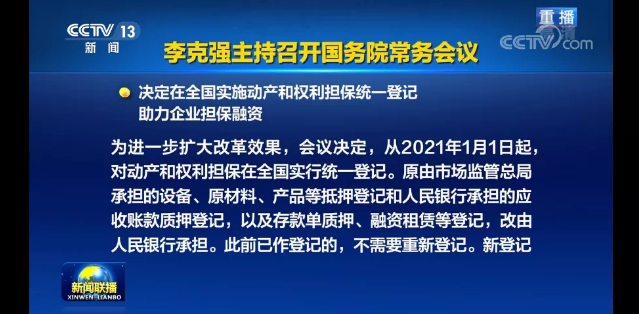 为优化营商环境、促进金融更好服务实体经济特别是中小微企业,近几年在部分省市开展了动产和权利担保统一登记试点,便利企业担保融资。试点中,民营和中小微企业新增担保登记业务占比超过95%、融资金额占比超过80%。为进一步扩大改革效果,会议决定,从2021年1月1日起,对动产和权利担保在全国实行统一登记。原由市场监管总局承担的生产设备、原材料、半成品、产品抵押登记和人民银行承担的应收账款质押登记,以及存款单质押、融资租赁、保理等登记,改由人民银行统一承担,提供基于互联网的7×24小时全天候服务。此前已作动产和权利担保登记的,不需要重新登记,有关部门要妥善做好存量信息数据移交等衔接工作。对新登记的,由当事人通过动产融资统一登记公示系统自主办理,并对登记内容的真实性、完整性和合法性负责;登记机构不对登记内容进行实质审查。实行统一登记,有助于金融机构全面掌握企业动产和相关权利信息,提升给企业担保融资的意愿。
