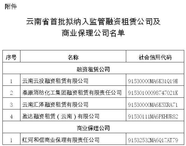 | 云南省:公布首批纳入监管的融资租赁公司名单 |
