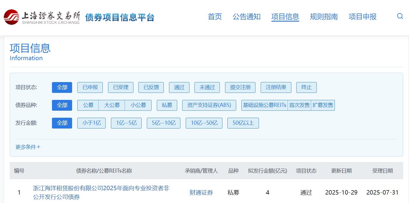 10月29日,浙江海洋租赁股份有限公司(以下简称“海洋租赁”)首次申报的私募公司债券顺利通过上海证券交易所专家会议审核,获批4亿元,资金主要用于支持融资租赁项目投放及偿还银行有息债务。 海洋租赁多年来致力于搭建多元化融资结构,既着力提升自身实力,也积极开拓资本市场直接融资渠道。自今年4月首次获得AA+主体信用评级后,在集团正确领导与支持下,海洋租赁多次牵头组织专题研讨,深入学习债券发行相关政策制度,协同财通证券优化公司债募集说明书,最终首支公司债券成功获批,开启了海洋租赁在公开市场进行直接融资的新篇章。 未来,海洋租赁将继续积极谋求拓展更多融资渠道,进一步优化融资结构、提高资金使用效率,从资金层面为公司未来的高质量稳健发展奠定坚实基础。