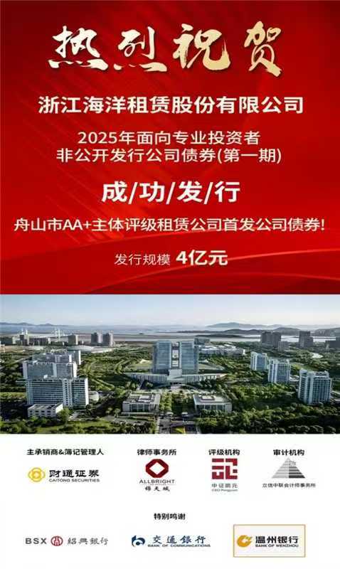 2025年12月25日,海洋租赁在资本市场迈出历史性步伐,自今年4月成功取得AA+信用评级后,相继成功发行首支储价式资产证券化产品及首支非公开发行公司债券,实现了融资品种的“双突破”。标志着公司融资渠道建设取得里程碑式跨越。 海洋租赁2025年面向专业投资者非公开发行公司债券(第一期)由财通证券担任主承销商,发行规模4亿元,期限3年,票面利率2.72%,募集资金将主要用于支持融资租赁项目投放及偿还银行有息债务等方面。实现舟山市AA+评级租赁公司的首发亮相。