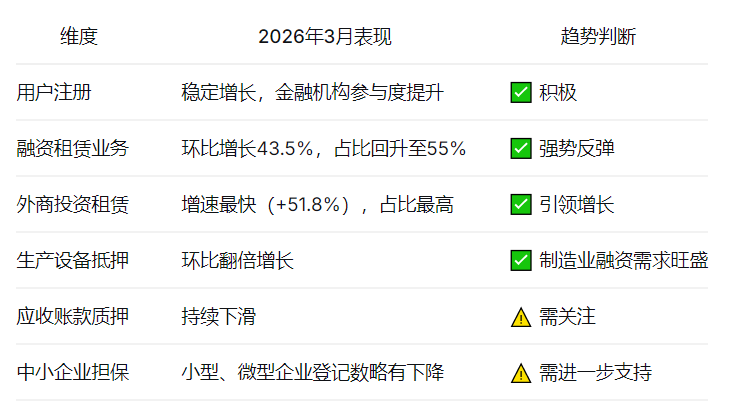根据2026年3月数据,融资租赁动产融资统一登记系统整体呈现积极复苏态势,融资租赁业务重回主导地位,但结构性分化依然存在。