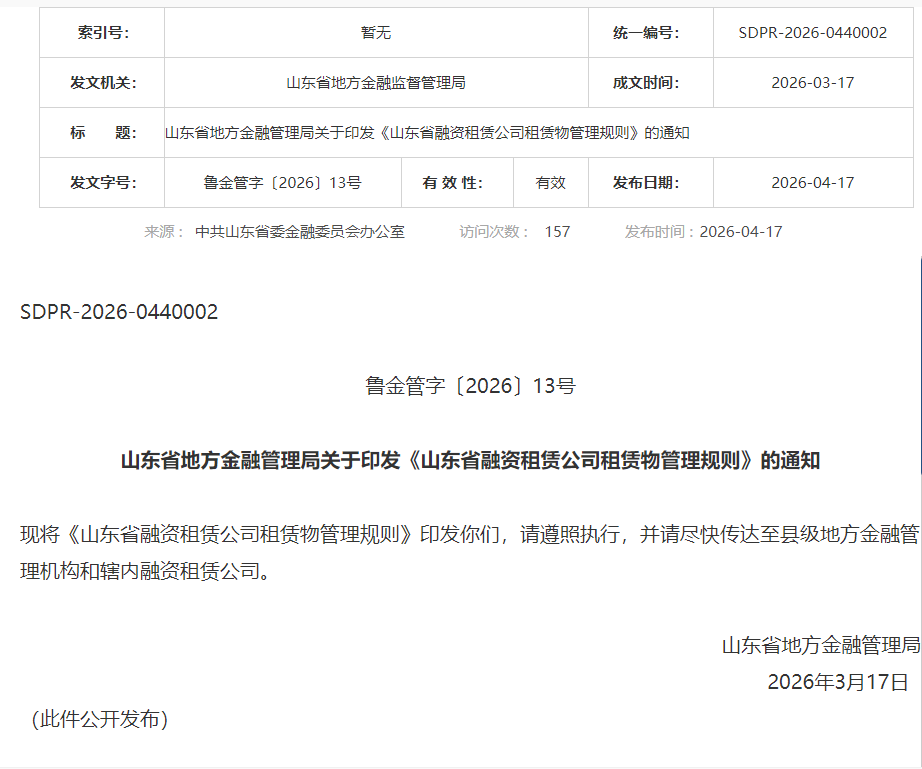 4月17日,山东省地方金融管理局发布了地方监管首个专门针对租赁物管理推出的管理规则——《山东省融资租赁公司租赁物管理规则》(鲁金管字〔2026〕13号,以下简称《规则》)。规则对租赁物合规管理提出严格要求,并明确严禁新增非设备类售后回租业务。