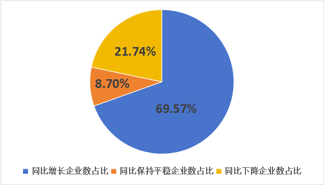 在纳税额维度,行业整体呈现显著增长态势,季度总量同比增长21.80%。样本企业中,69.57%的企业实现同比增长,8.70%的企业保持稳定。纳税额的快速增长与主营业务收入的增长趋势相符,共同体现了行业经营规模与效益的同步提升。