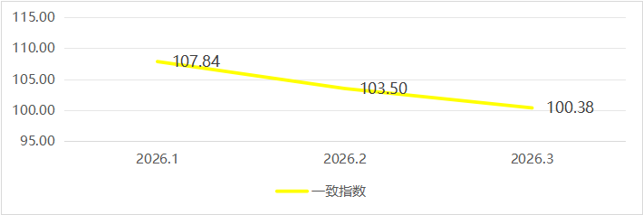 图表4 样本单位2026年一季度社保缴纳人数同比增长率走势 一致指数表现 2026年一季度,浙江省融资租赁行业一致指数月度值分别为107.84(1月)、103.50(2月)、100.38(3月)。相比上年同期数据,一季度均值较上年同期增长0.99%。各月指数高位起步后平稳回落。一季度,国内制造业PMI在3月重返扩张区间;大规模设备更新政策持续发力。年初需求集中释放后,行业经营节奏张弛有序。